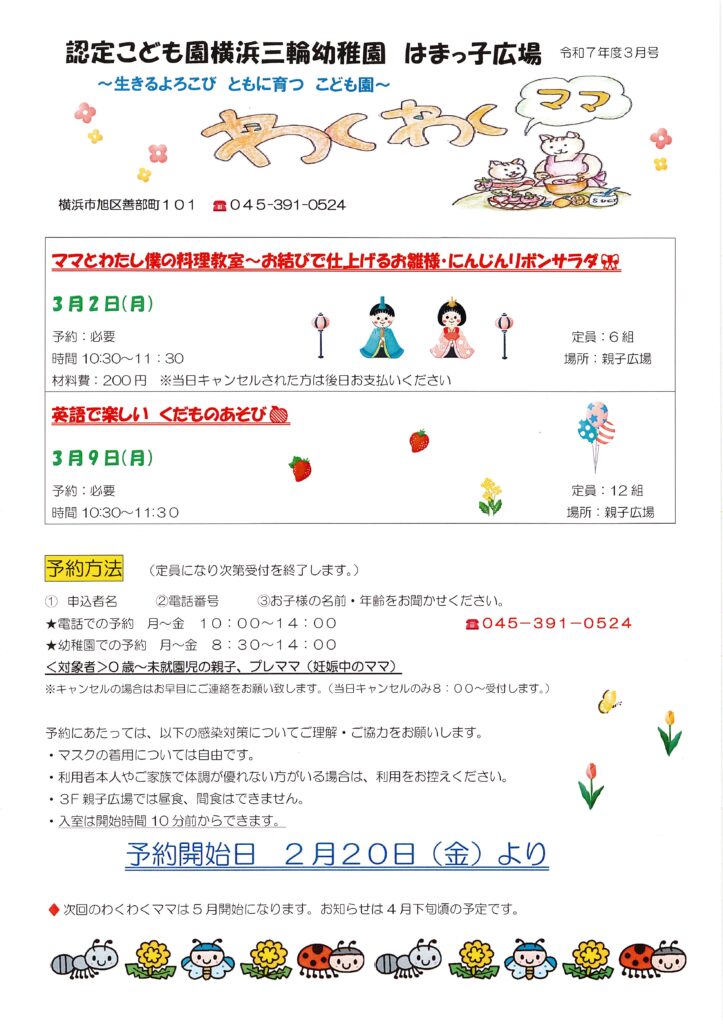 3月わくわくママご案内2日、9日*2月20日予約開始